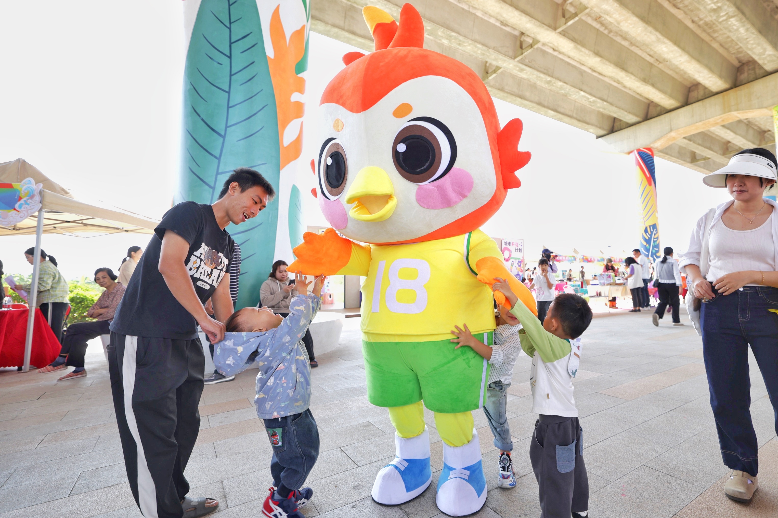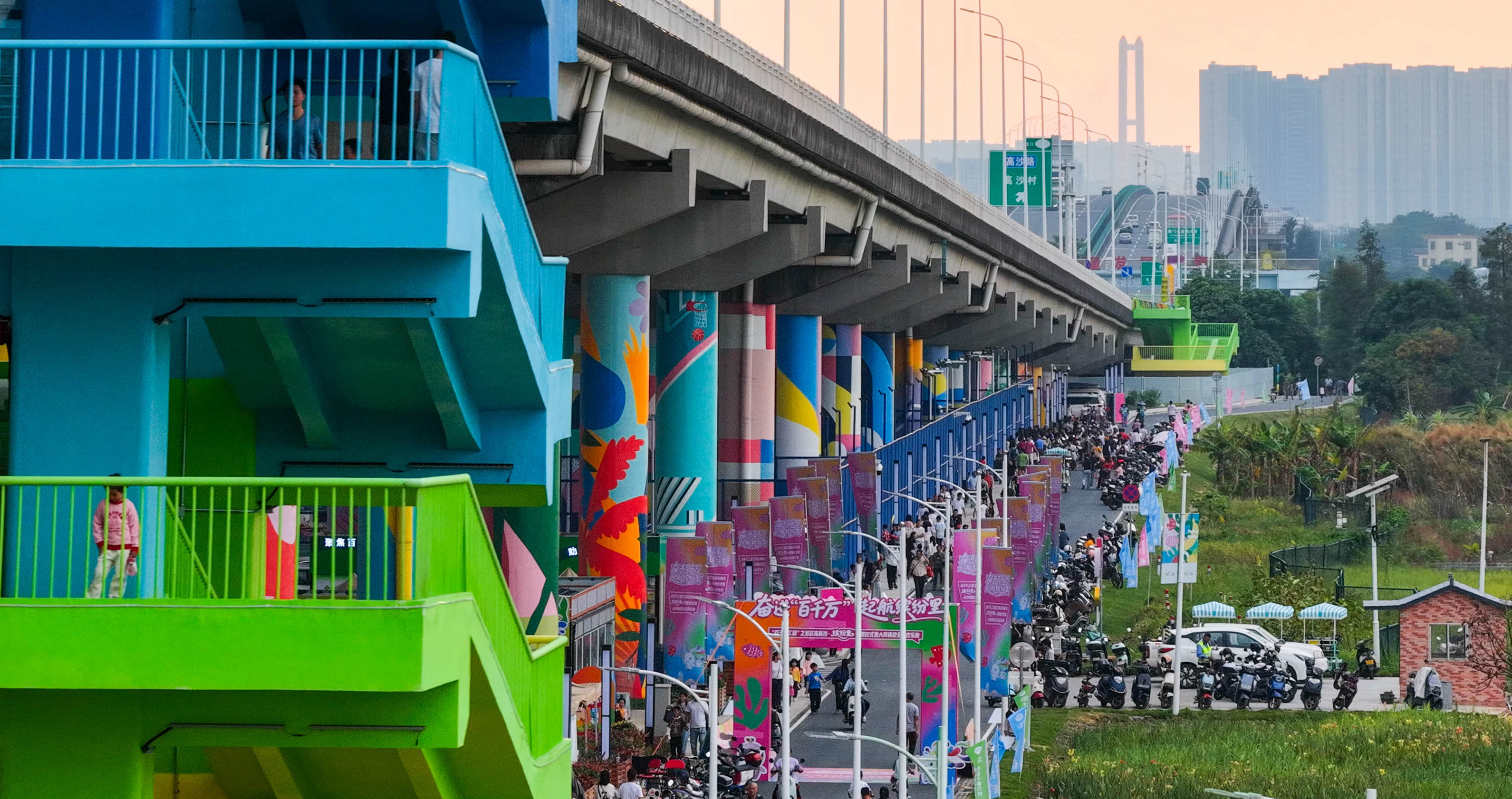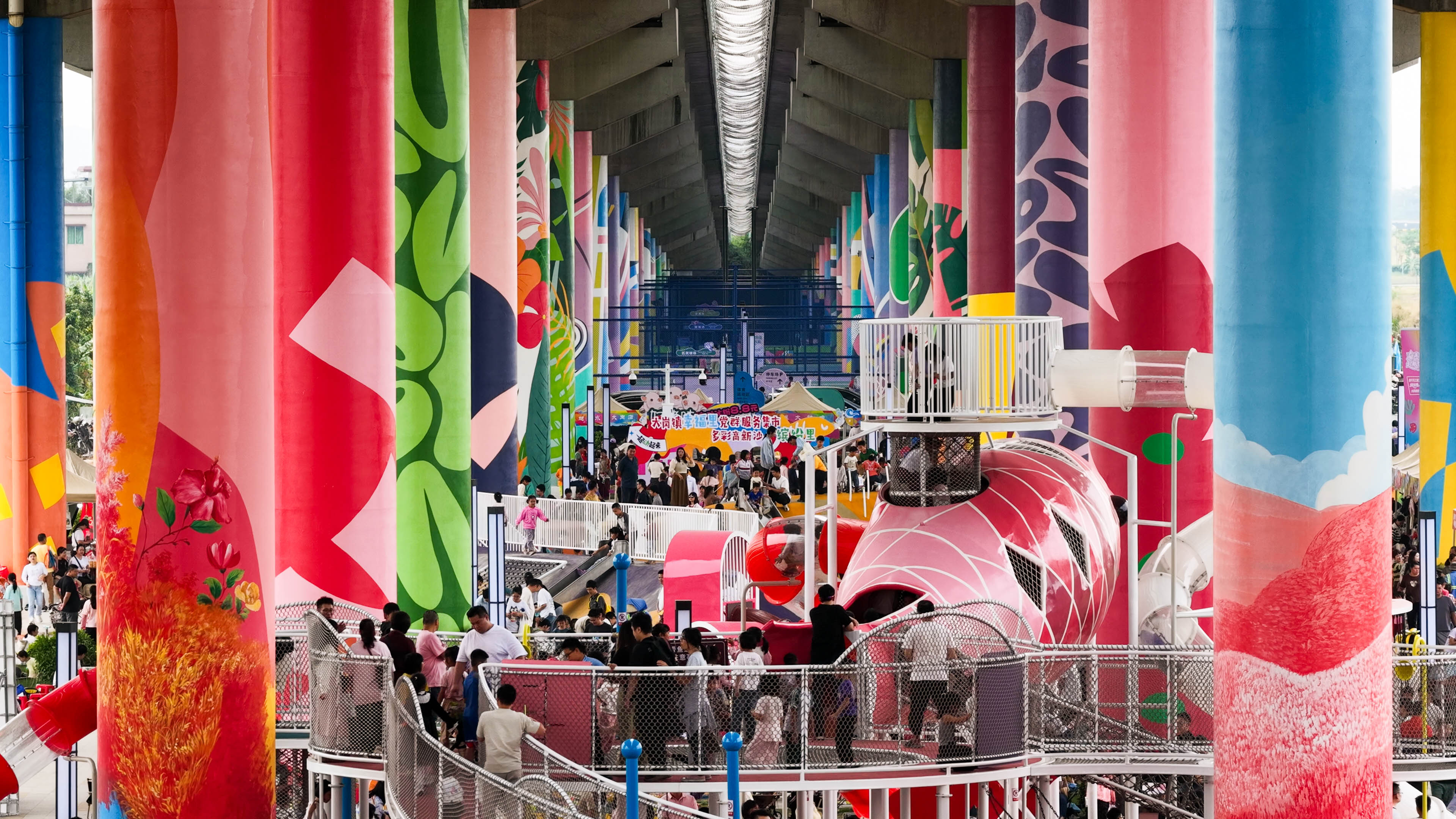 桥下世界宛如童话秘境,五彩斑斓的桥墩延伸向远方,独特的游乐设施吸引着众多市民游玩。