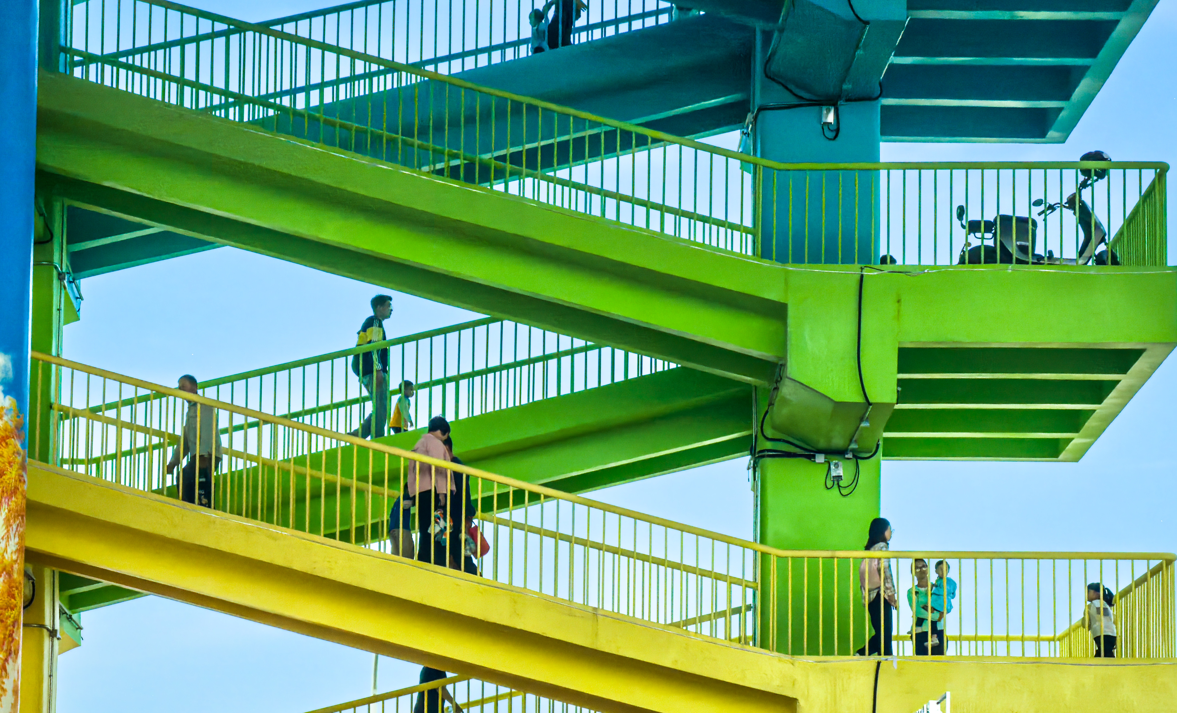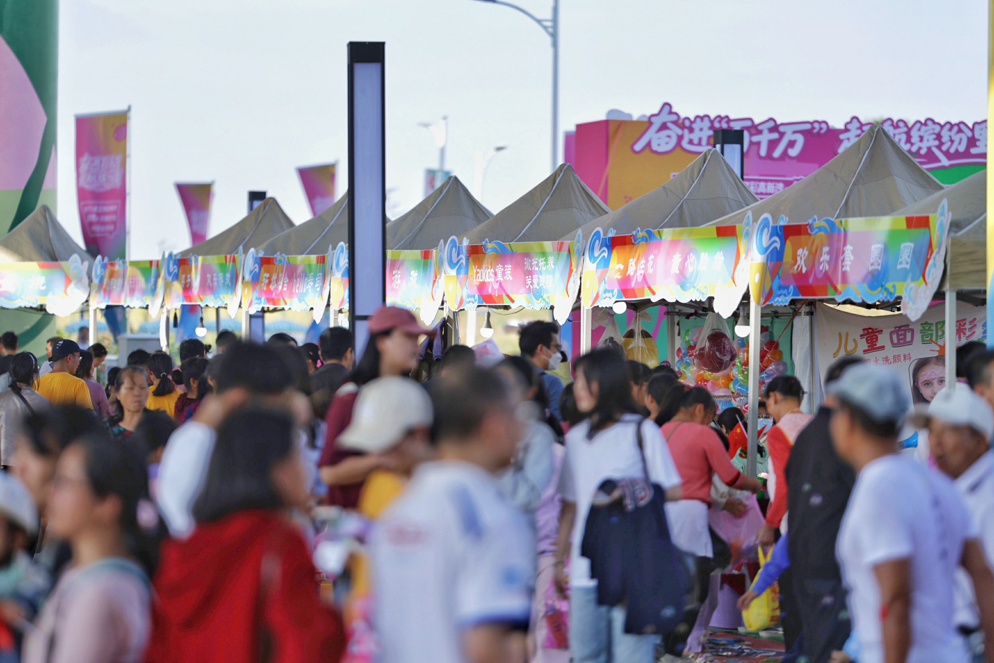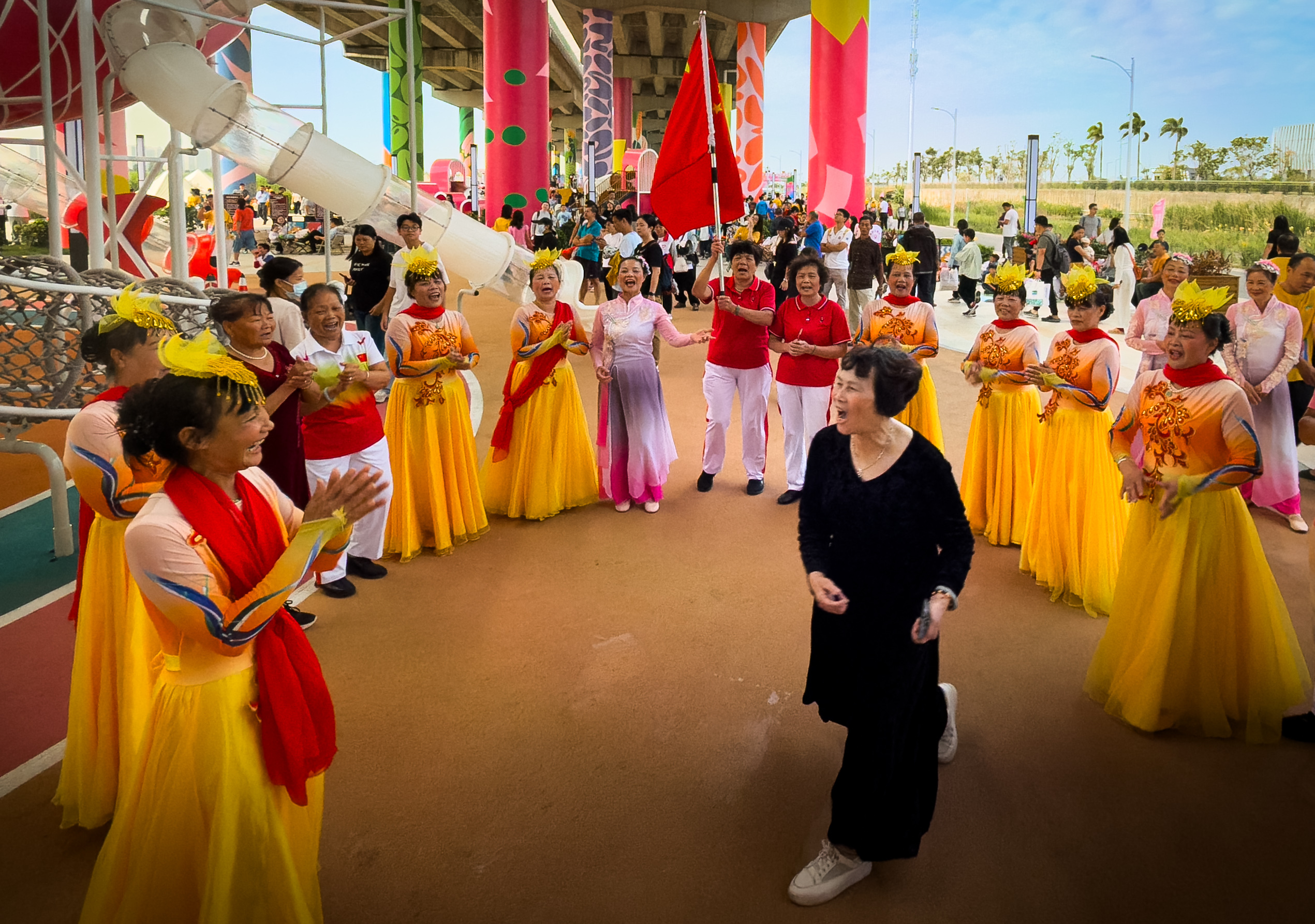 桥下世界宛如童话秘境,五彩斑斓的桥墩延伸向远方,独特的游乐设施吸引着众多市民游玩。