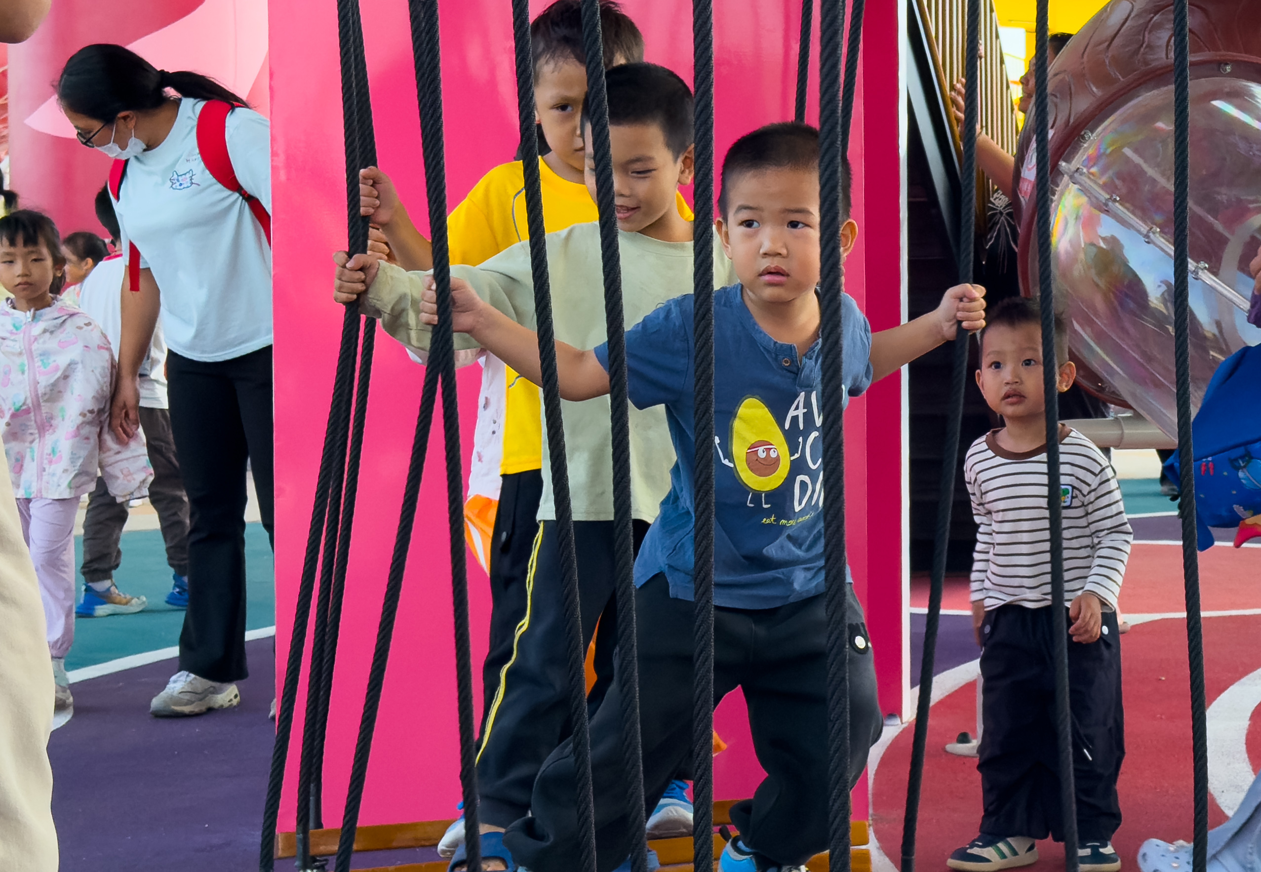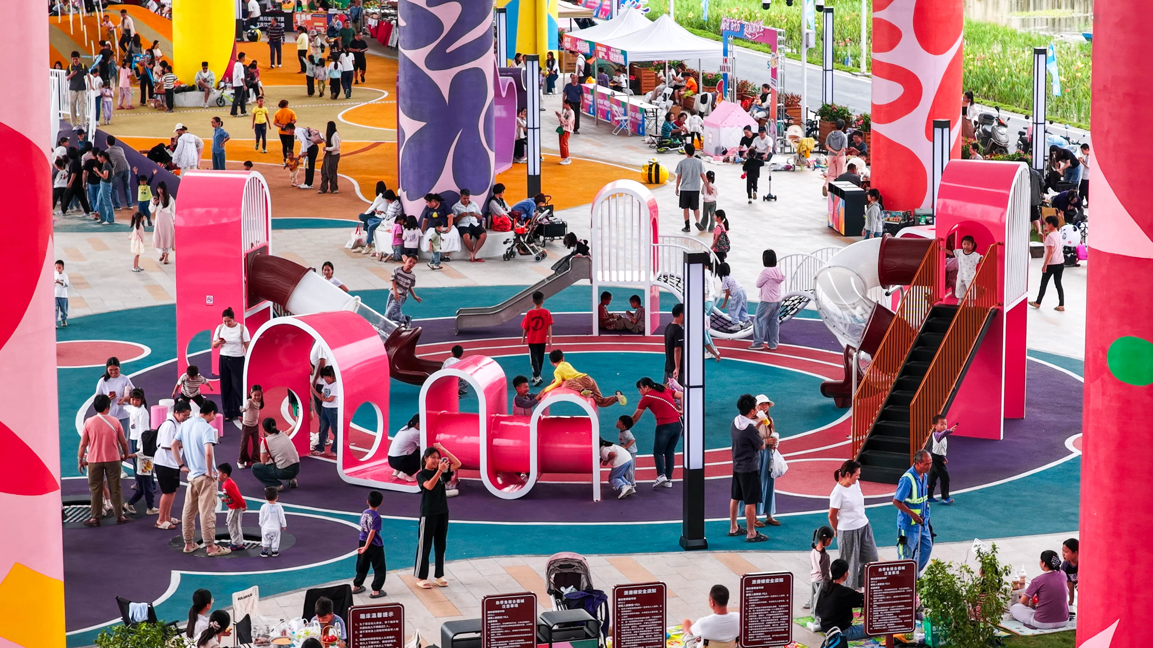 亲子乐园内热闹非凡,孩子们在色彩鲜艳的滑梯、攀爬设施间嬉戏玩耍。