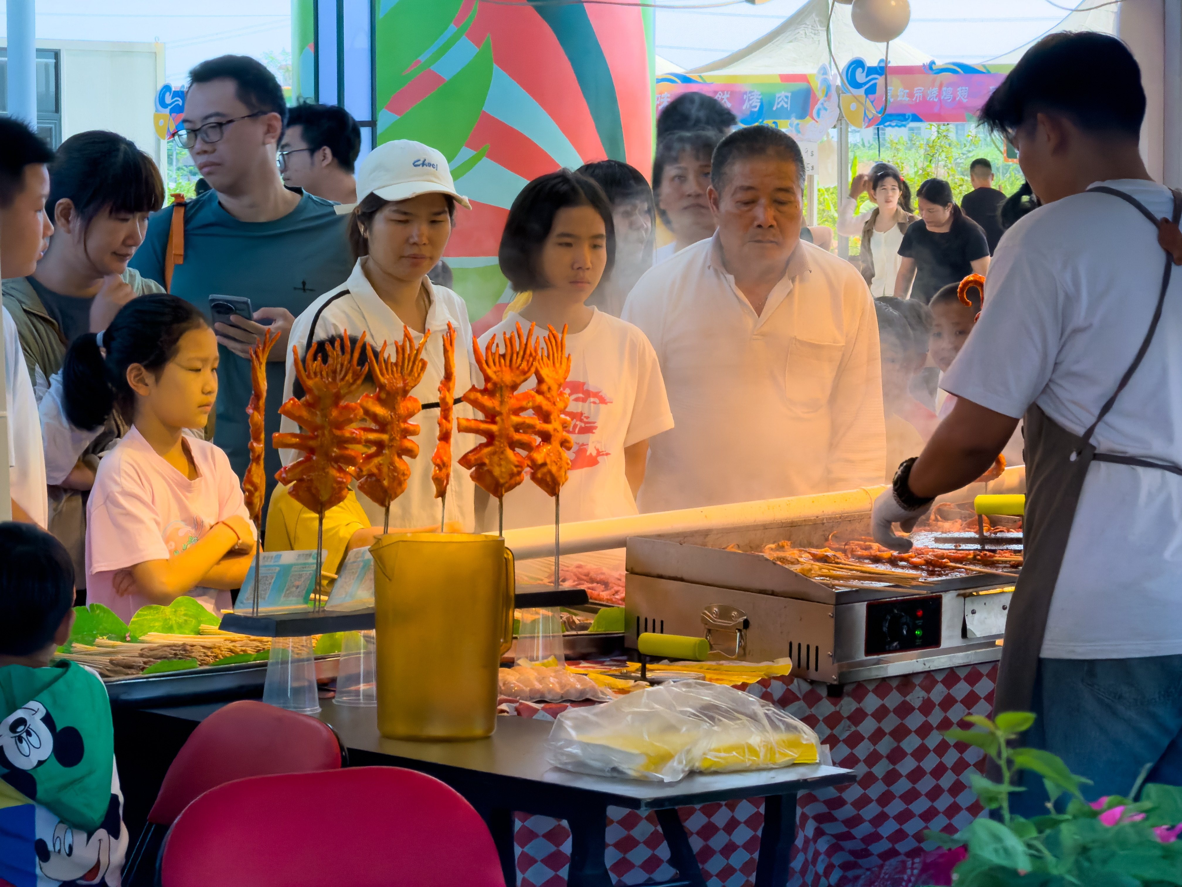 美食集市摊位前,市民们在排队购买烧烤等美食。