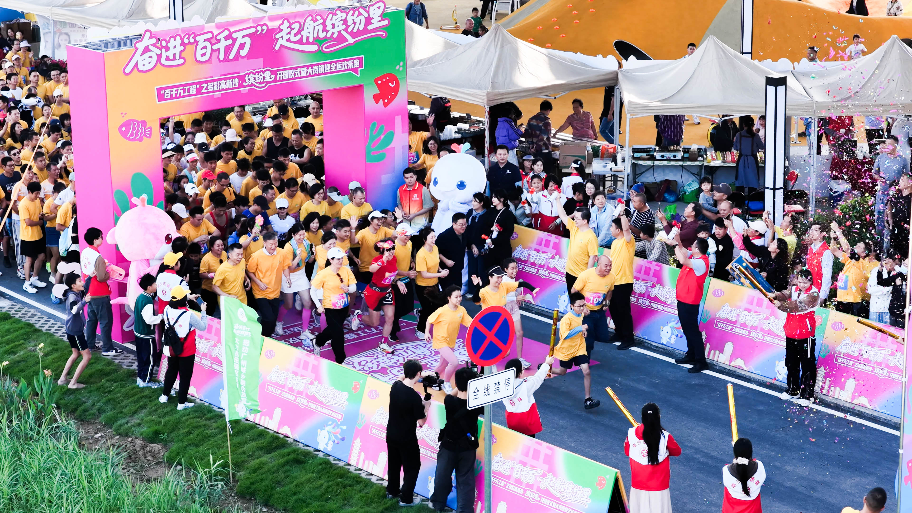 欢乐跑活动开跑,参赛选手们从色彩缤纷的起点拱门冲出。